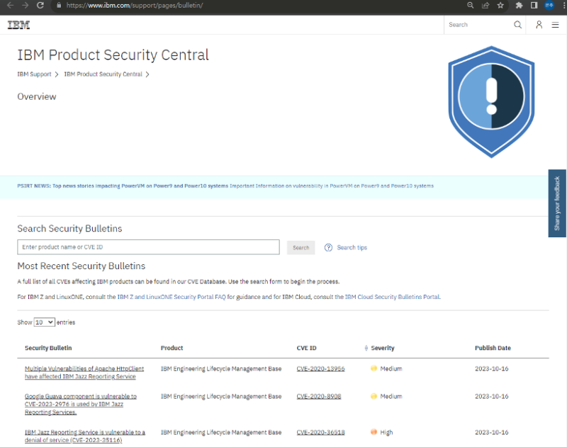 IBM PSIRT 프로세스를 통해 IBM 보안 취약점 관한 업데이트들을 내부 데이터이스를 구축하고 있어 IBM Product Security Central 사이트에서 제품명 또는 CVE번호로 검색하여 해당 정보를 빠르게 확인하실 수 있습니다.
