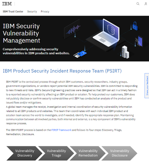 IBM과 같은 글로벌 제품 개발사들은 제품 보안 사고대응팀(Product Security Incident Response Team, #PSIRT)을 자체적으로 운영하고 있습니다.