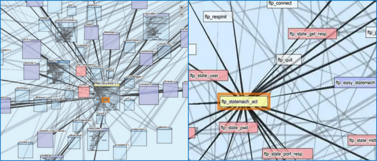 우리는 복잡한 소프트웨어를 다이어그램/UML 등의 형태로 나타내어 해당 소프트웨어의 이해관계자들과 서로 소통 및 협업하는 경우가 굉장히 많습니다. 그 이유는 복잡한 소프트웨어를 간단하고 이해하기 쉽게 나타내기 위해서인데요, 그래서, 보통 모듈 또는 유닛 단위로 나타내는 경우가 많습니다. 그러나, 프로젝트 내 모든 파일 또는 함수 간의 의존성을 확인하기 위해 다이어그램 형태로 나타낼 경우, 오히려 다음의 [그림 1]과 같이 소프트웨어 내 구조 및 의존성 관계를 파악하는 것이 더 어려워질 수 있습니다.