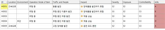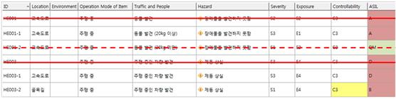 자율 주행 자동차를 대상으로 한 HARA에서는 앞서 언급한 바와 같이 제어 가능성을 최고 등급인 C3로 반영하는 것이 가장 바람직하다고 할 수 있다. 자율 주행 자동차에 탑재된 AEB (Autonomous Emergency Brake)가 고속도로를 주행하던 중 도로 상에서 동물을 발견한 경우를 예를 들면 SAE J2980에 따라 심각도 S는 2를 VDA 702에 따라 노출 빈도 E도 2를 부여할 수 있으며 제어 가능성 C는 최고 등급인 3을 부여하여 최종 ASIL은 A가 결정된다.