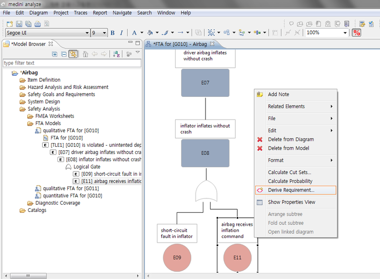 위의 요구사항은 기능 안전 요구사항을 도출할 때, 안전 분석(Safety Analysis) 활동을 활용할 수 있음을 나타내고 있다. 이와 관련하여 ISO 26262 전문 도구인 medini analyze는 FTA를 활용하여 안전 요구사항을 도출할 수 있는 기능을 제공한다.