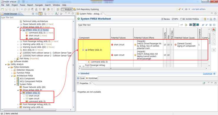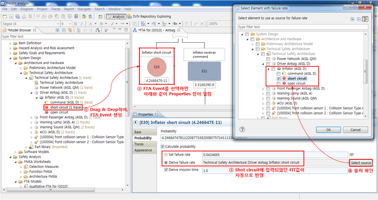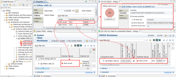 위의 그림은 Inflator의 고장 형태인 Short Circuit이 ISO26262에 제시되어 있는 안전분석 중 FMEA, FTA, FMEDA에서 모두 일관성을 유지한 채로 반영된 예시를 보여준다. 여러 번 반복되어 수행되는 안전분석 활동 간에, 동일한 데이터가 적용되어 있음을 볼 수 있다.