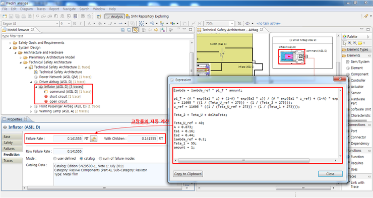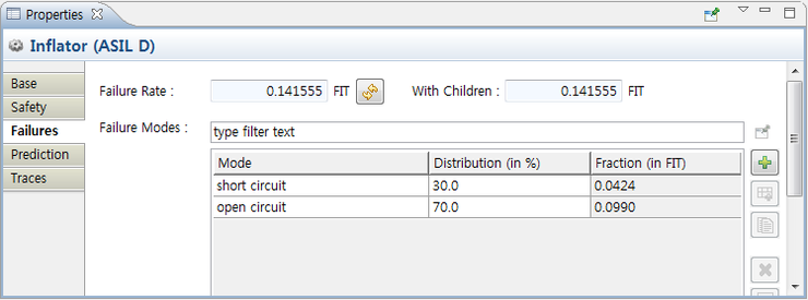 예를 들어, Inflator의 고장 형태는 Short circuit과 Open circuit이 있다. 이 Inflator의 고장률은 Siemens Catalog인 SN29500을 활용하여 0.141555FIT값으로 자동 계산되었다. (하기 그림 참조)