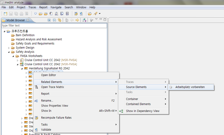 기존에 FMEA 전용 도구에서 작성한 FMEA 데이터가 있다면 MSR 포맷의 FMEA 데이터 파일을 Export 할 수 있습니다. 이 데이터 파일을 medini analyze에 Import하여 FTA 혹은 FMEDA와 같은 안전 분석에 확장하여 사용할 수 있습니다.
